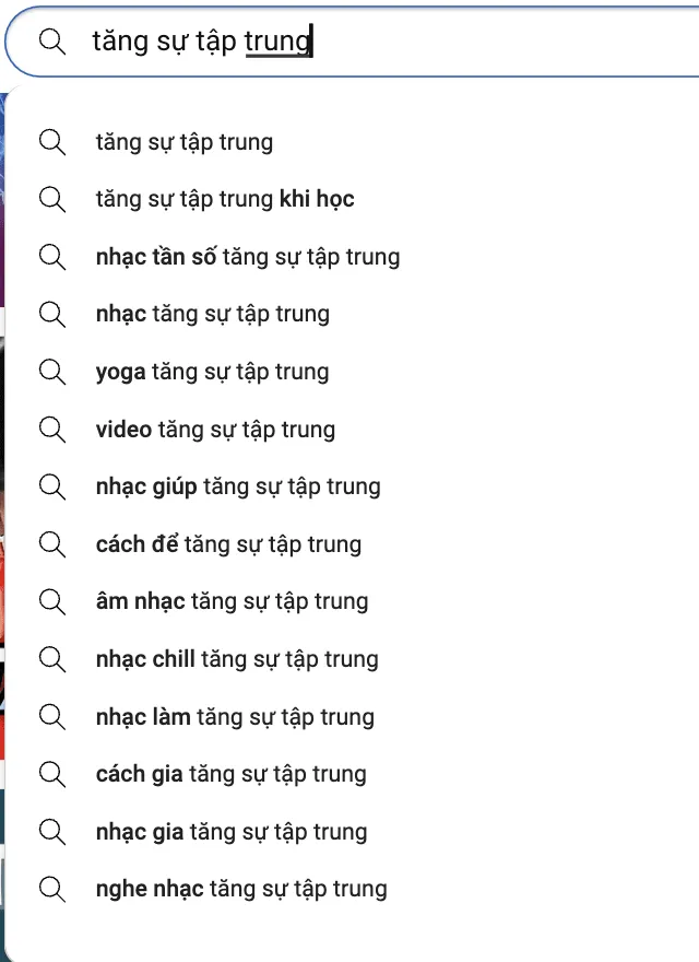 Danh sách các từ khóa gợi ý liên quan đến cách tăng sự tập trung xuất hiện trên thanh tìm kiếm YouTubeDanh sách các từ khóa gợi ý liên quan đến cách tăng sự tập trung xuất hiện trên thanh tìm kiếm YouTube