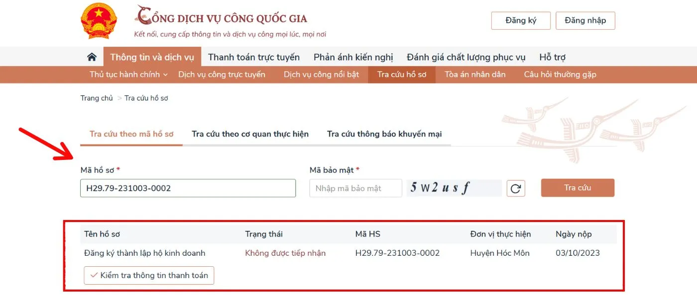 Chọn mục tra cứu hồ sơ trên Cổng Dịch vụ công Quốc gia sau khi hoàn tất thủ tục đăng kýChọn mục tra cứu hồ sơ trên Cổng Dịch vụ công Quốc gia sau khi hoàn tất thủ tục đăng kýNhập mã hồ sơ và mã xác nhận để theo dõi tiến độ cấp giấy phép đăng ký hộ kinh doanhNhập mã hồ sơ và mã xác nhận để theo dõi tiến độ cấp giấy phép đăng ký hộ kinh doanh