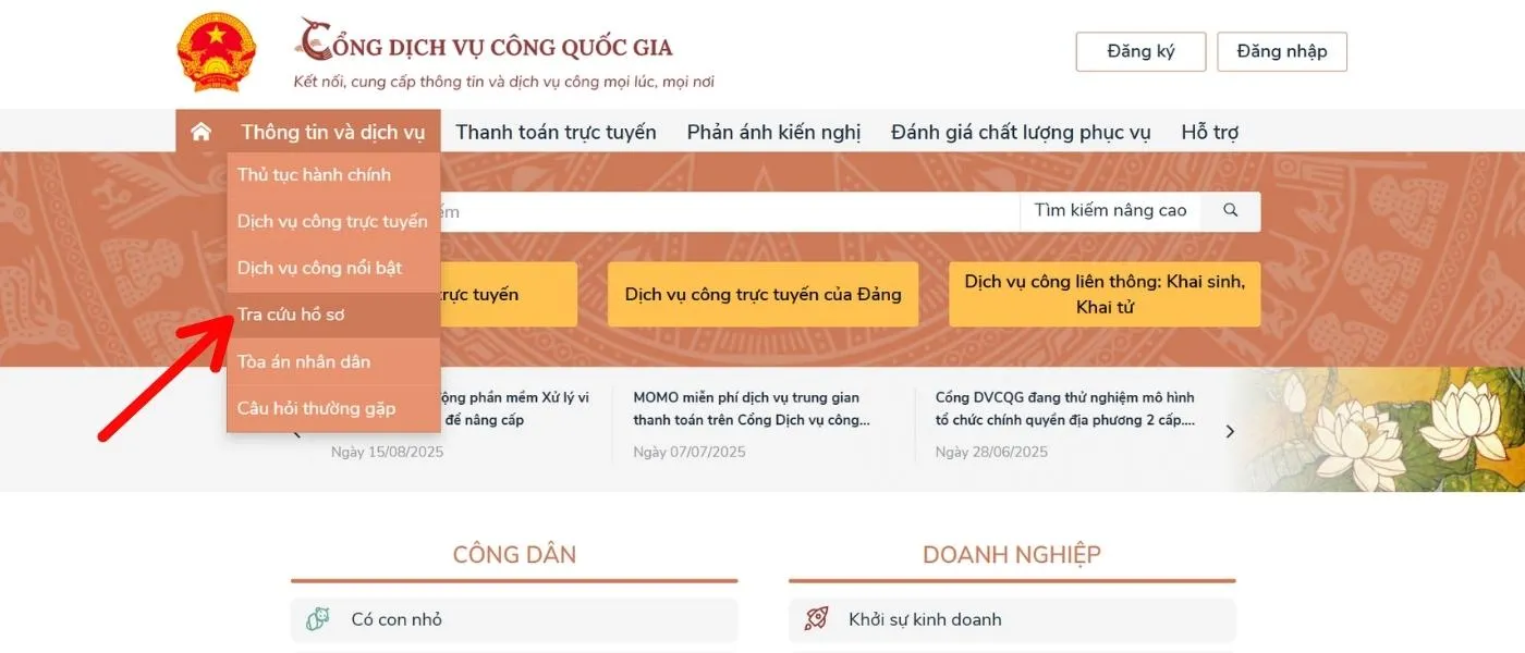 Trên trang chủ của Cổng Dịch vụ công Quốc gia, bạn cần tìm và chọn mục “Tra cứu hồ sơ”. Mục này thường nằm ở phần thông tin và dịch vụ của trang web.