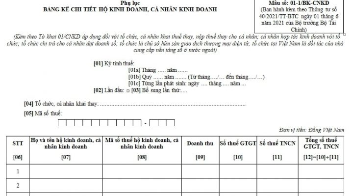 Ngoài ra, hộ kinh doanh cũng cần nộp Phụ lục Bảng kê hoạt động kinh doanh trong kỳ mẫu số 01-2/BK-HĐKD. Tuy nhiên, phụ lục này không cần nộp nếu hộ kinh doanh có cơ sở xác định được doanh thu từ xác nhận của cơ quan chức năng. Việc đảm bảo tính đầy đủ và chính xác của hồ sơ là trách nhiệm của người đại diện theo pháp luật.