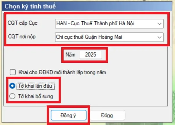 Sau khi chọn mẫu tờ khai, một cửa sổ mới sẽ hiện ra yêu cầu chọn “Năm” tính thuế. Người dùng nhập năm mà địa điểm kinh doanh phải nộp lệ phí môn bài (ví dụ: 2025). Tiếp theo, chọn “Tờ khai lần đầu” nếu đây là lần đầu tiên kê khai cho địa điểm kinh doanh hoặc khi có thay đổi thông tin. Cuối cùng, nhấn “Đồng ý” để tiếp tục.