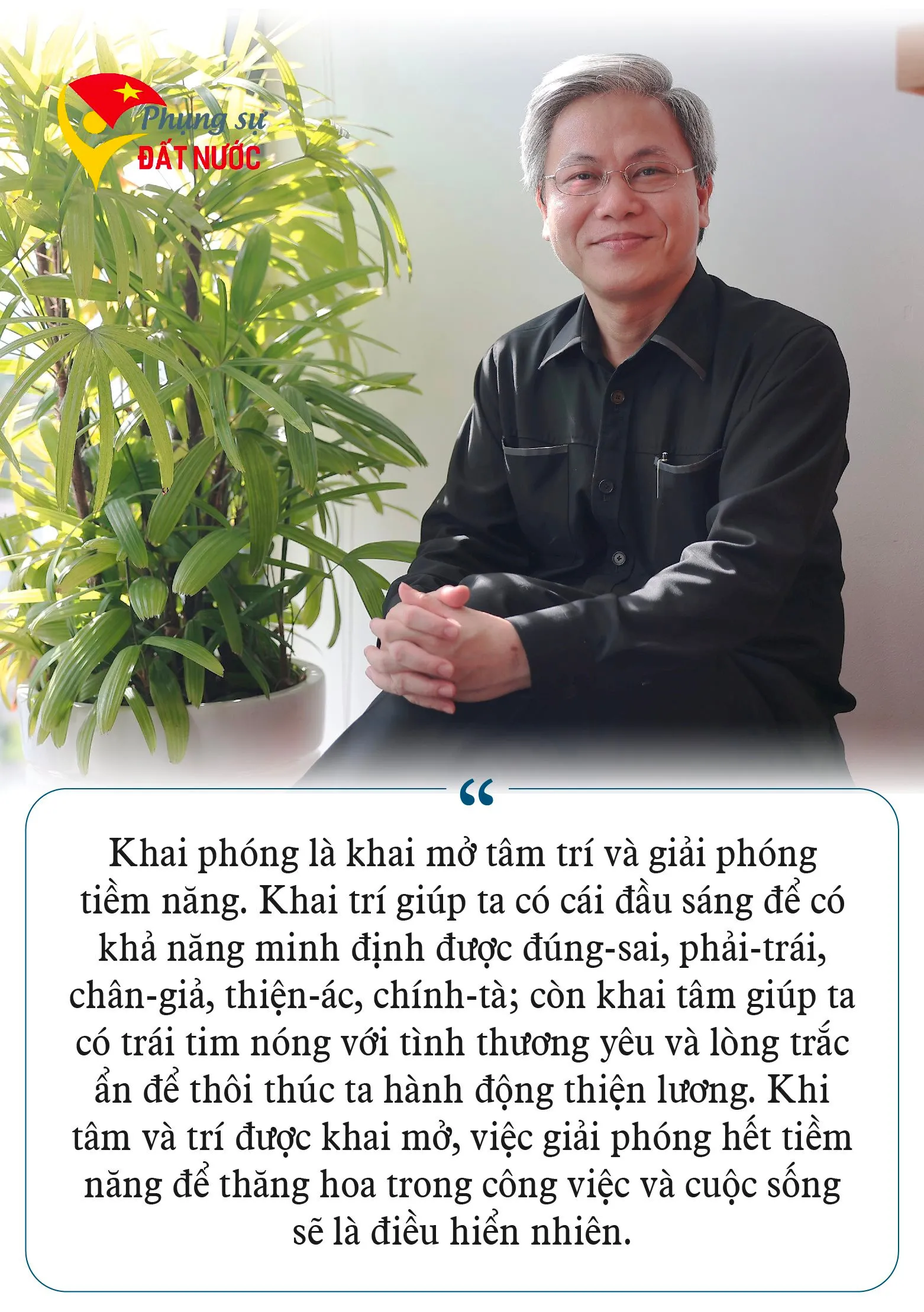 Khai phóng có nghĩa là khai mở tâm trí và giải phóng tiềm năng. Khai trí giúp con người minh định được đúng-sai, chân-giả, thiện-ác. Khai tâm giúp con người có trái tim nóng với tình thương yêu và lòng trắc ẩn. Khi tâm và trí được khai mở, tiềm năng được giải phóng hoàn toàn để thăng hoa trong công việc và cuộc sống.