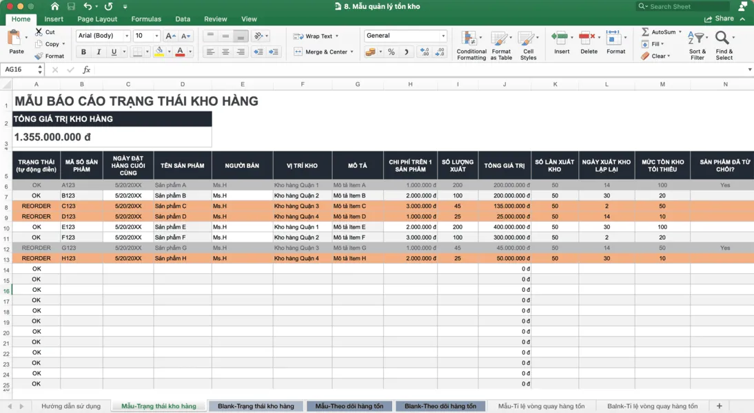 Quản lý quản lý kho là nhiệm vụ không thể thiếu. Sheet này giúp bạn kiểm soát hàng hóa nhập xuất và xác định số lượng hàng tồn kho cuối kỳ.