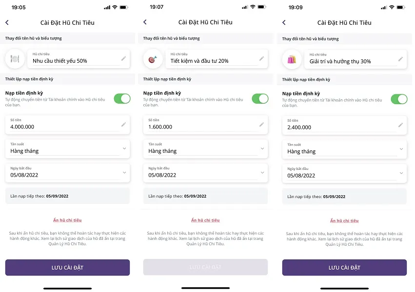 Hũ Chi Tiêu cho phép bạn tạo ra các “tài khoản phụ” ảo ngay trong tài khoản chính. Mỗi Hũ có thể đại diện cho một mục tiêu chi tiêu cụ thể. Bạn có thể đặt tên, icon và mục tiêu cho từng Hũ.