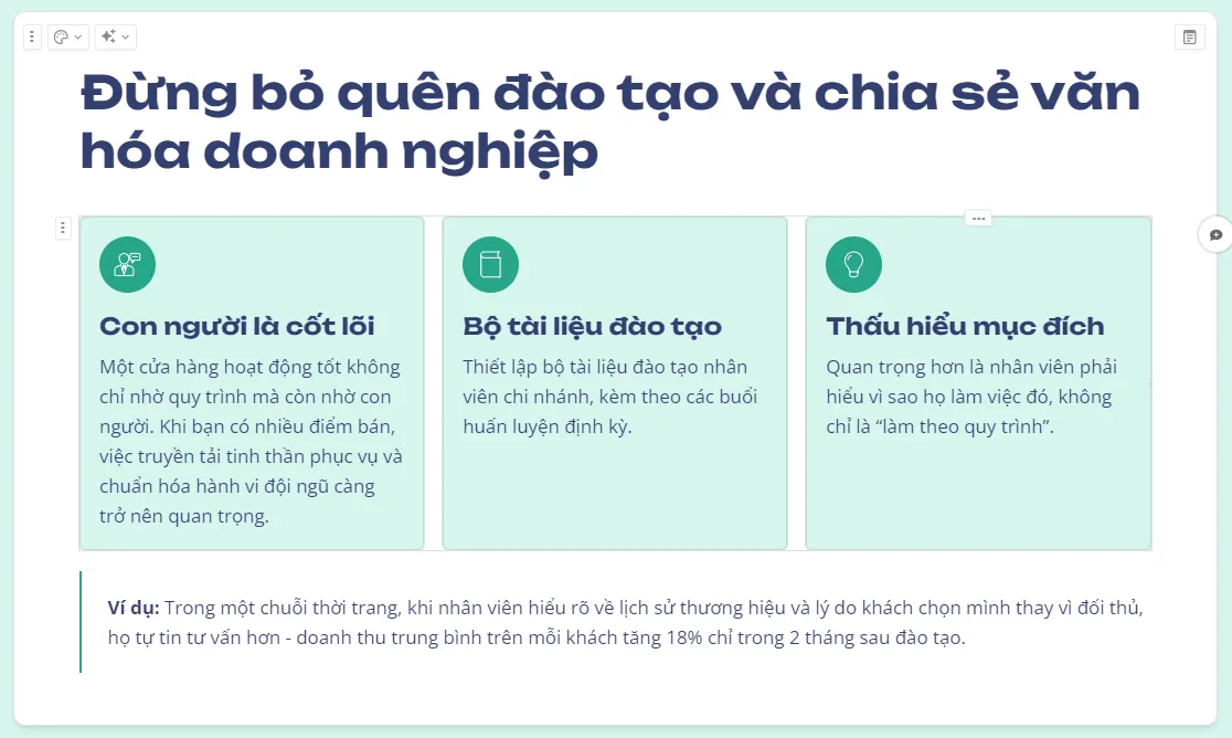 Chủ doanh nghiệp cần thiết lập bộ tài liệu văn hóa. Nó dùng để đào tạo nhân viên chi nhánh. Huấn luyện định kỳ giúp nhân viên hiểu rõ “vì sao họ làm việc đó”. Họ không chỉ làm theo quy trình máy móc. Họ phải hiểu rõ giá trị cốt lõi của thương hiệu.