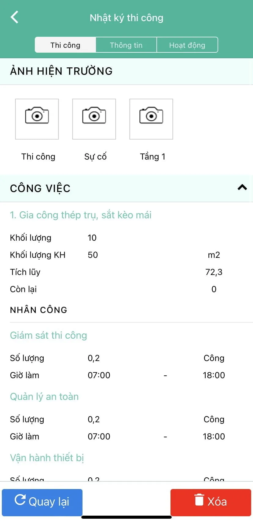 Kỹ sư công trình cập nhật báo cáo trực tiếp và nhanh chóng vào nhật ký khối lượng thi công trên ứng dụng mobile FastCons