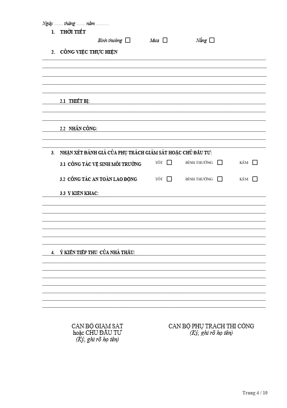 Việc ghi chép nhật ký khối lượng thi công hàng ngày là bắt buộc. Mẫu nhật ký này ghi lại vật tư và thiết bị sử dụng thực tế. Nó cũng cập nhật tiến độ, điều kiện thời tiết và số lượng nhân công. Bất kỳ vấn đề hay sự cố nào cũng phải được mô tả rõ ràng.