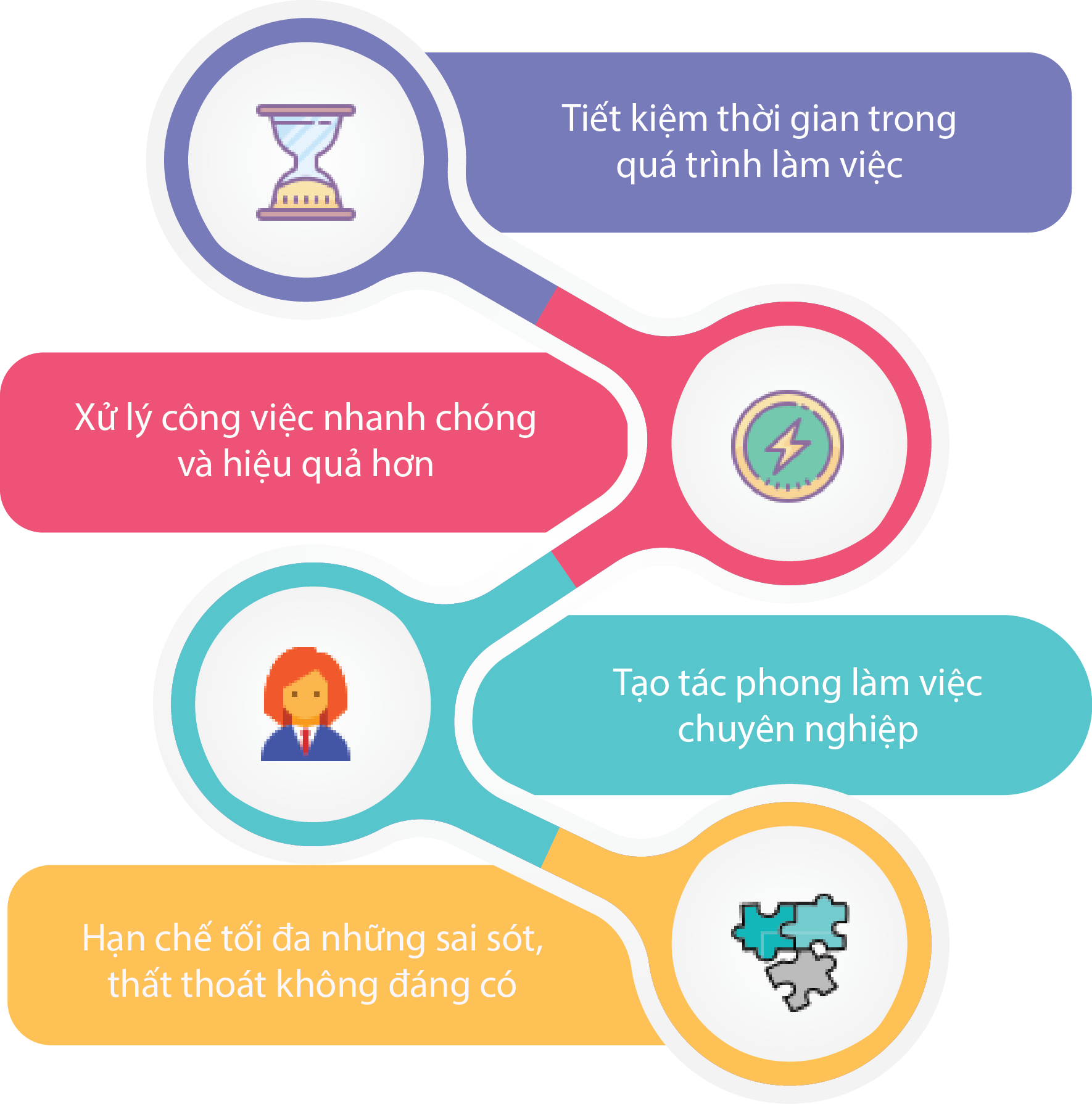Phần mềm ERP giúp tích hợp toàn bộ các quy trình nghiệp vụ của doanh nghiệp vào một hệ thống duy nhất, từ tài chính kế toán, mua hàng, bán hàng, quản lý kho, đến quản lý sản xuất và quản trị nhân sự. Lợi ích đầu tiên là năng suất lao động tăng đáng kể. Dữ liệu đầu vào chỉ cần nhập một lần cho mọi giao dịch liên quan, và các báo cáo được thực hiện nhanh hơn, chính xác hơn. Hệ thống loại bỏ đáng kể các thao tác thủ công và giảm thiểu sai sót dữ liệu.