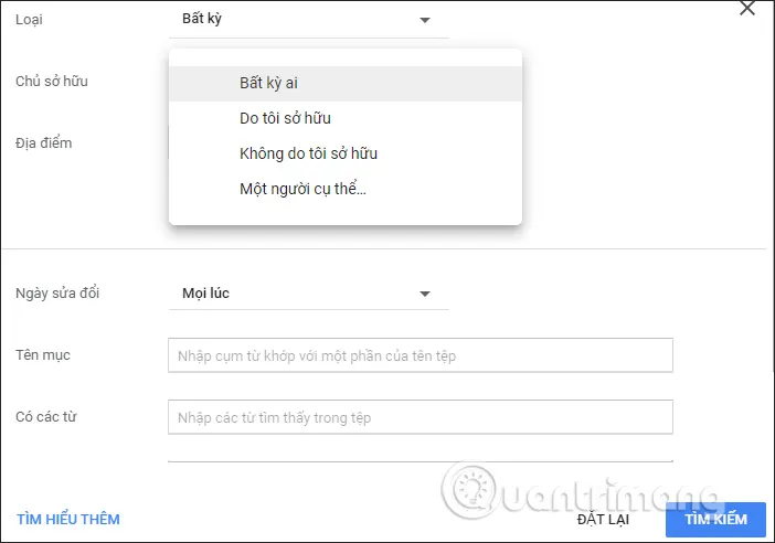 Giao diện tìm kiếm nâng cao trên Google Drive với các tùy chọn lọc chi tiết