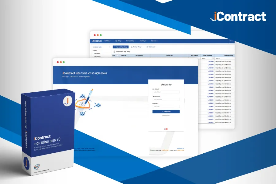 Giao diện chi tiết phần mềm quản lý hợp đồng iContract, thể hiện các tính năng quản lý tài khoản và báo cáo