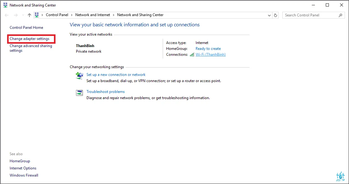 Chọn Change adapter settings để thay đổi cấu hình adapter mạng