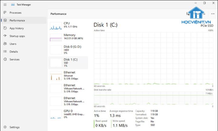 Tab này hiển thị các chỉ số quan trọng như CPU, Memory, Disk, Network, và GPU. Đây là nơi bạn có thể theo dõi ứng dụng nào đang tiêu thụ nhiều tài nguyên nhất. Việc theo dõi giúp bạn quyết định có nên kết thúc một tác vụ nào đó không.