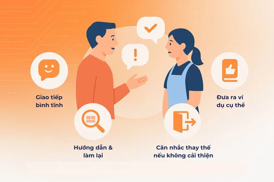 Thay vì đưa ra nhận xét trừu tượng như “dọn chưa sạch,” hãy đưa ra bằng chứng và ví dụ cụ thể. Ví dụ: “Khu vực bồn rửa chén này vẫn còn vết thức ăn khô, lần sau chị có thể ngâm nước nóng trước khi cọ nhé.” Việc này giúp họ hiểu rõ vấn đề và biết chính xác cần cải thiện ở đâu. Luôn cho người làm cơ hội để sửa sai và kiên nhẫn hướng dẫn lại quy trình nếu cần. Chỉ xem xét việc thay thế khi đã góp ý nhiều lần mà tình hình không có bất kỳ cải thiện nào đáng kể.