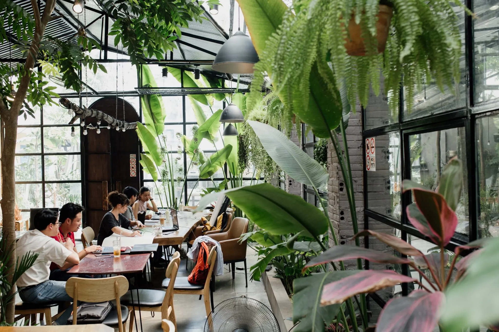 Một góc không gian nội thất quán cafe hiện đại với ánh sáng ấm áp và khách hàng đang làm việc