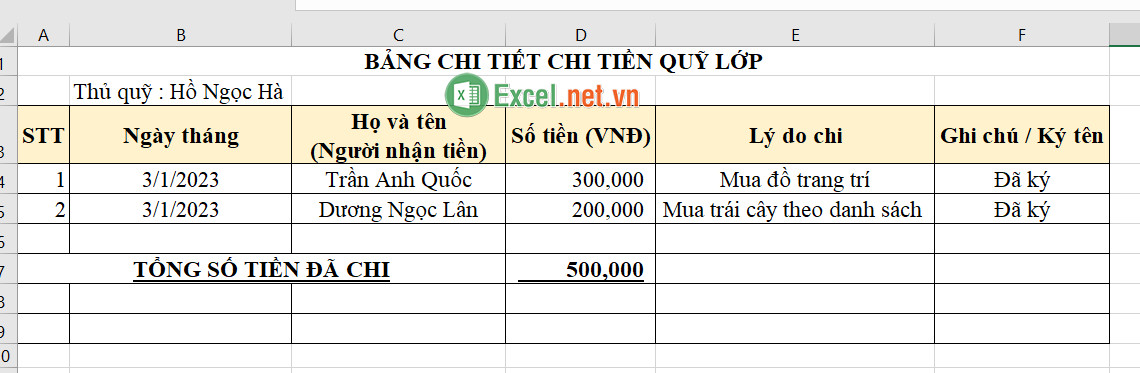 Mỗi khoản chi tiêu phải có sự phê duyệt trước (thường là từ giáo viên chủ nhiệm hoặc ban cán sự lớp). Khi chi tiền, thủ quỹ phải yêu cầu hóa đơn, biên nhận, hoặc lập giấy đề nghị thanh toán và có chữ ký xác nhận của người nhận tiền. Việc lưu trữ chứng từ là bắt buộc để phục vụ công tác quyết toán sau này.