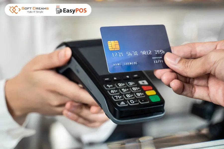 Nhân viên thu ngân đang sử dụng máy POS để xử lý thanh toán cho khách hàng