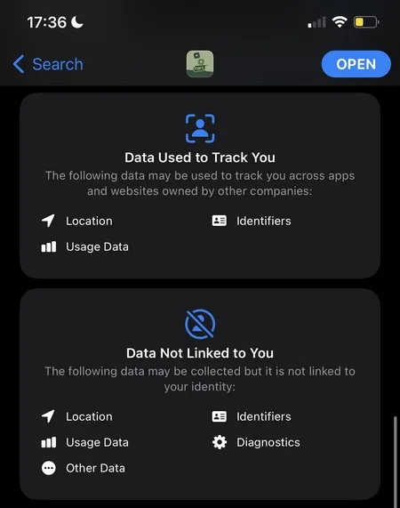 Giao diện mục Data Linked to You trên App Store, hiển thị các loại dữ liệu mà ứng dụng sẽ thu thập### Hướng Dẫn Điều Chỉnh Quyền Truy Cập Cụ Thể