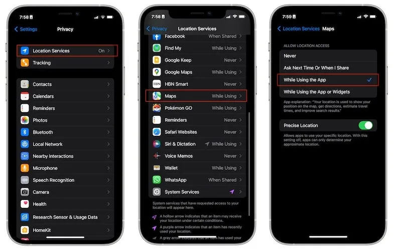 Khi cấp quyền vị trí, bạn có bốn tùy chọn: Không (Never), Hỏi Lần Sau (Ask Next Time), Khi Dùng Ứng Dụng (While Using the App), hoặc Luôn Luôn (Always). Hầu hết các ứng dụng chỉ cần quyền “Khi Dùng Ứng Dụng”. Bạn nên tắt tùy chọn “Vị trí Chính xác” (Precise Location) cho các ứng dụng không cần đến độ chính xác cao, như các ứng dụng thời tiết thông thường.