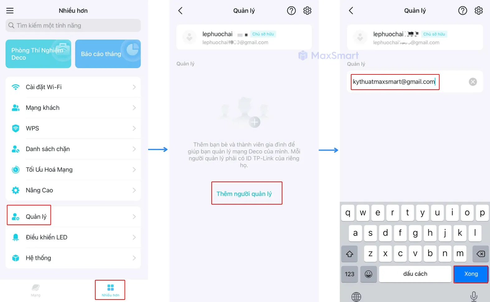 Sau khi đã thiết lập xong các quyền hạn, bước tiếp theo là mời người dùng phụ thông qua TP-Link ID (Email) của họ. Quá trình này hoàn tất việc liên kết tài khoản phụ với hệ thống Deco.