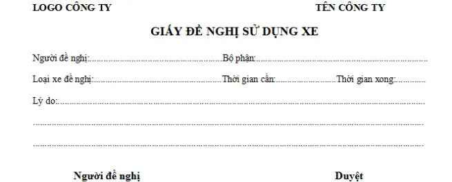 Người có nhu cầu sử dụng xe công ty phải lập văn bản đề nghị điều xe theo mẫu quy định của công ty. Văn bản này cần ghi rõ mục đích chuyến đi, thời gian dự kiến, tuyến đường và số lượng người đi. Trưởng phòng hoặc cấp quản lý có thẩm quyền sẽ là người xem xét và phê duyệt.