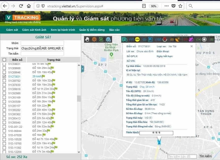 Giao diện giám sát hành trình và vị trí đội xe trên web, giúp theo dõi thời gian thực và lịch sử chuyến đi