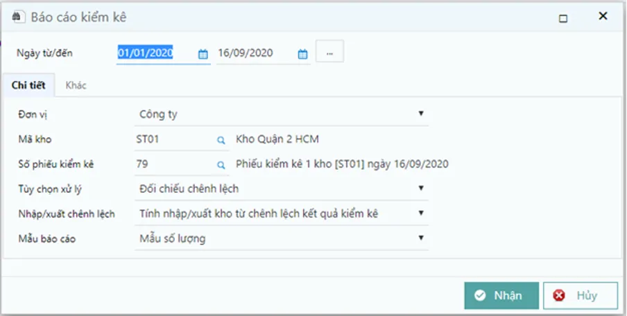 Giao diện Báo cáo kiểm kê kho, thể hiện các tùy chọn xử lý như đối chiếu chênh lệch