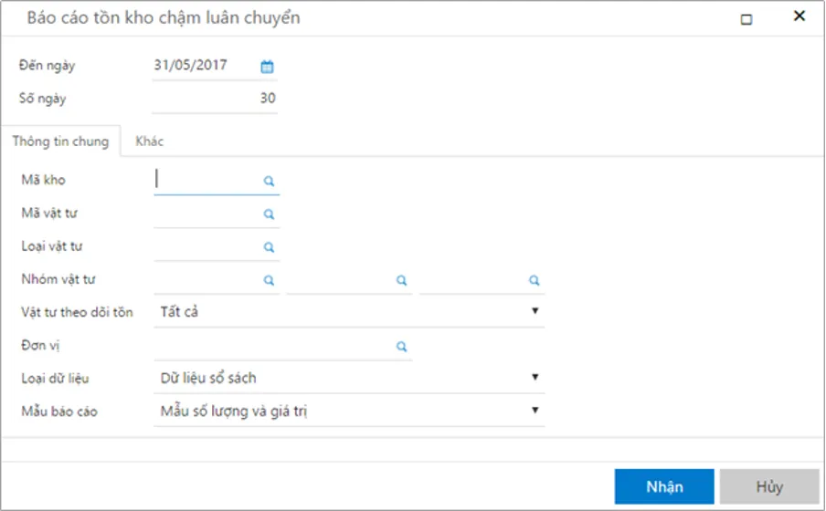 Báo cáo này liệt kê các vật tư không được xuất kho trong một số ngày quy định. Hàng chậm luân chuyển là dấu hiệu cảnh báo. Nó có thể dẫn đến tồn đọng vốn và giảm giá trị hàng hóa.