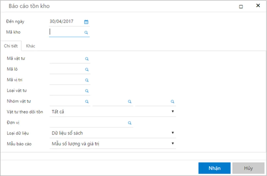 Người dùng cần chú ý đến các trường lọc. Trường Từ ngày đến ngày giúp giới hạn thời gian cần xem. Đối tượng tồn kho cho phép chọn Mã kho, Mã vật tư, Mã lô, hoặc Mã vị trí.