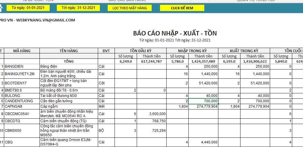 Quản lý tồn kho là một phần không thể thiếu. Nó giúp bạn tránh tình trạng hết hàng hoặc tồn kho quá nhiều. Trong Sheet Nhập/Xuất Kho, bạn cần theo dõi Tồn Đầu Kỳ, Nhập Trong Kỳ và Xuất Trong Kỳ.