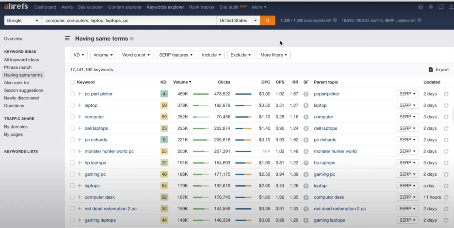 Danh sách từ khóa do Ahref trả về, hữu ích cho việc xây dựng chiến lược nội dung và sản phẩm khi kinh doanh trên Amazon.