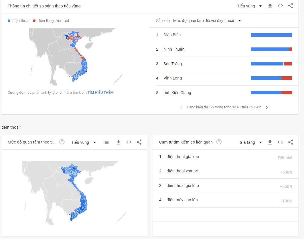Bên cạnh đó, công cụ này còn cung cấp bản đồ phân bố mức độ quan tâm theo từng tỉnh thành. Điều này giúp bạn khoanh vùng thị trường tiềm năng. Đặc biệt, phần “Từ khóa liên quan” với các mục “Gia tăng” và “Đột phá” sẽ chỉ ra những chủ đề đang nổi lên. Đây chính là các thị trường ngách có nhu cầu tăng trưởng mạnh mẽ mà bạn nên tập trung.