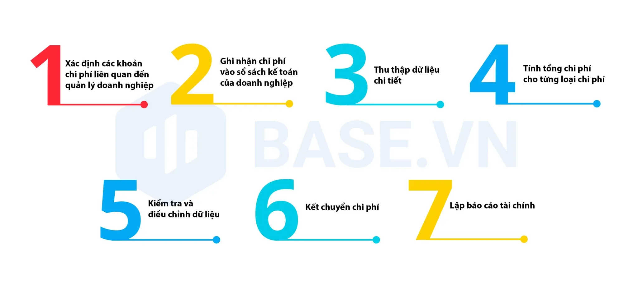 Quy trình tính toán chi phí quản lý doanh nghiệp là một chuỗi các bước hạch toán chính xác. Nó bắt đầu từ việc xác định chi phí và kết thúc bằng việc lập báo cáo tài chính tổng hợp. Để đảm bảo tính chính xác và tuân thủ pháp luật, các doanh nghiệp cần thực hiện đúng 7 bước cơ bản sau đây.