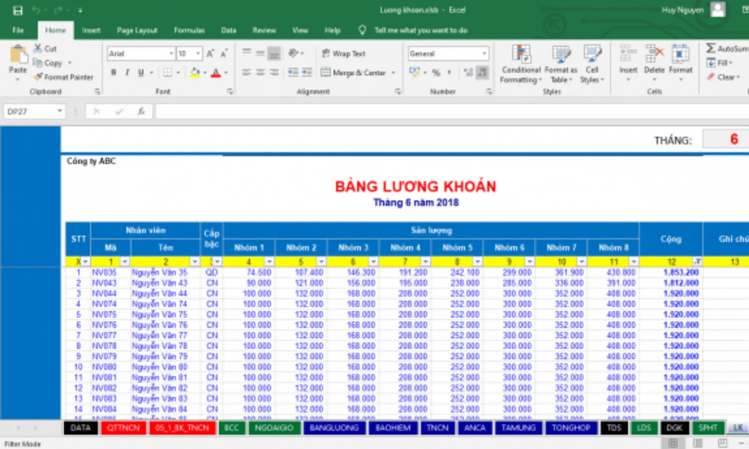 Mô hình bảng thanh toán lương theo doanh thu áp dụng cho nhân viên kinh doanh