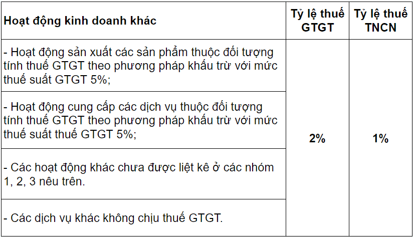 - Tỷ lệ thuế suất: Là tổng tỷ lệ phần trăm của thuế GTGT và thuế TNCN. Tỷ lệ này phụ thuộc vào ngành nghề kinh doanh.