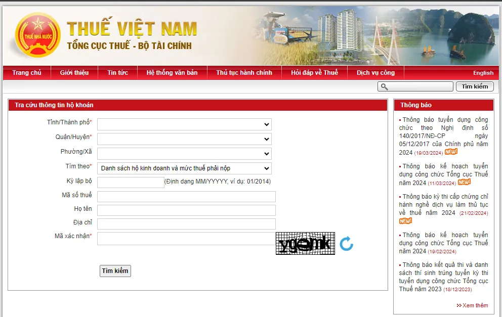 Để tra cứu thông tin hộ khoán, bạn cần truy cập vào Trang thông tin điện tử chính thức của Tổng cục Thuế. Đường link truy cập thường là https://www.gdt.gov.vn/wps/portal/home/hct.