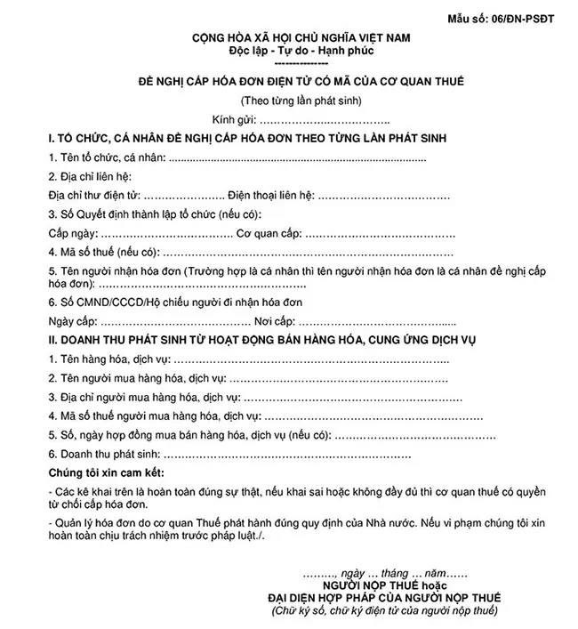 Mẫu đơn 06/ĐN-PSHĐĐT dùng để đề nghị Cơ quan Thuế cấp hóa đơn điện tử lẻ