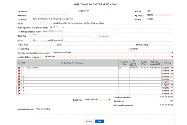 Đăng nhập vào hệ thống HĐĐT và chọn chức năng tạo hóa đơn mới. Người dùng cần điền đầy đủ thông tin theo mẫu. Các trường bắt buộc nhập bao gồm Tên hóa đơn, Địa chỉ đơn vị, Tên khách hàng, Hình thức thanh toán và Danh sách sản phẩm/dịch vụ.